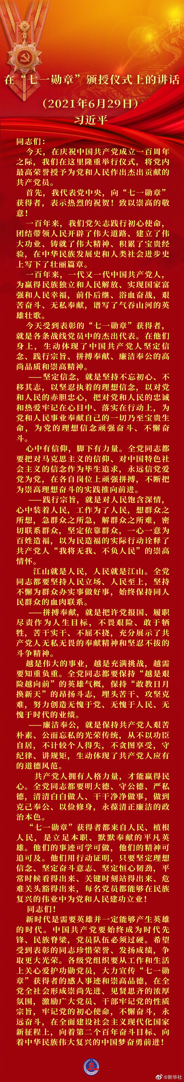 習(xí)近平在慶祝中國共產(chǎn)黨成立100周年“七一勛章”頒授儀式上發(fā)表重要講話
